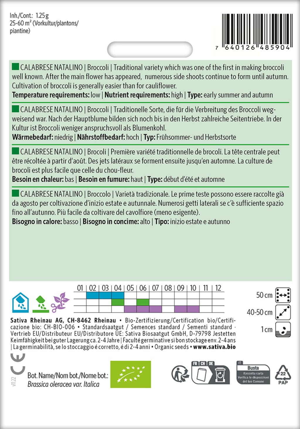 Calabrese Natalino je tradiční odrůda brokolice s vynikající chutí. Kromě sklizně hlavní růžice lze až do podzimu sklízet také četné postranní výhony, které se průběžně tvoří.