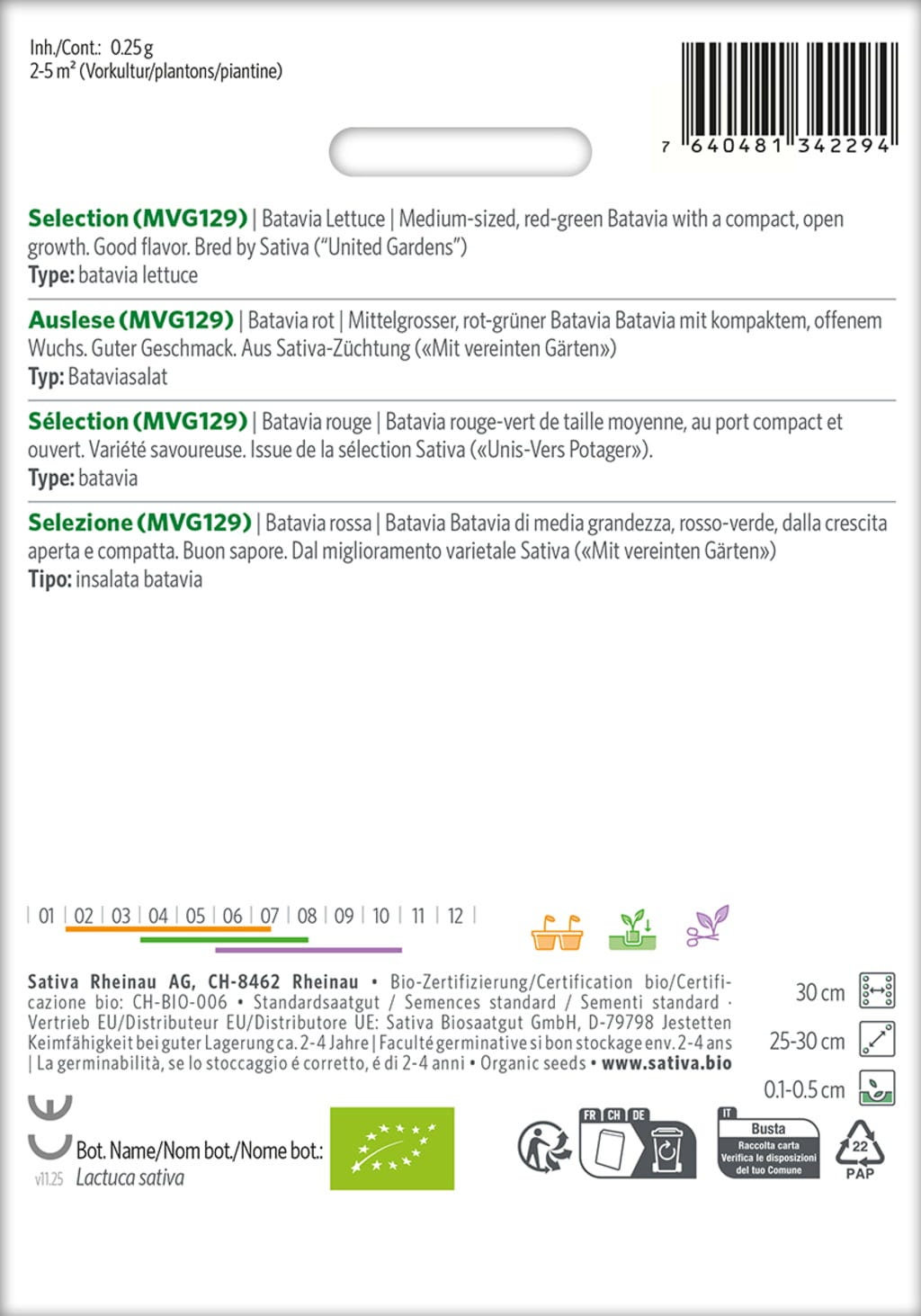 Tento hlávkový salát je červeno-zelená Batavia s kompaktním a otevřeným vzrůstem a velmi dobrou chutí. Pochází ze šlechtění Sativa „Mit vereinten Gärten“ a je ideální pro čerstvé saláty přímo ze zahrady.