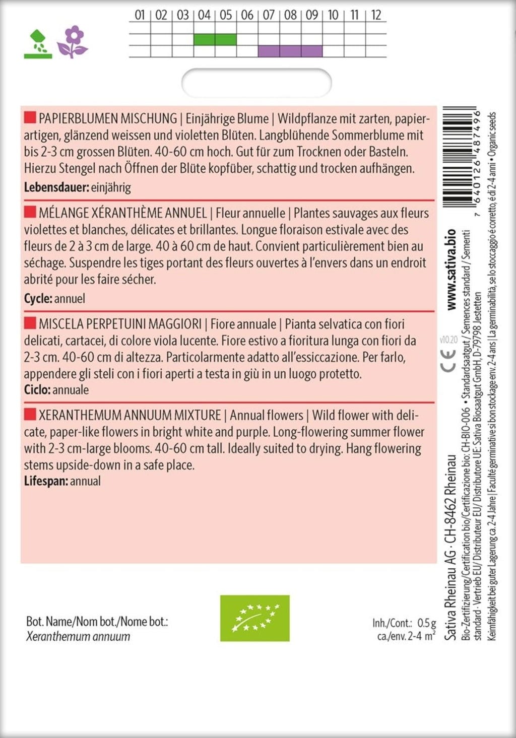 Tato směs suchokvětů vytváří bílé a fialové květy, jejichž okvětní lístky jsou na dotek jako papír a mají průměr cca 2-3 cm. Díky svému jedinečnému vzhledu jsou ideální k sušení a tvoření dekorací.