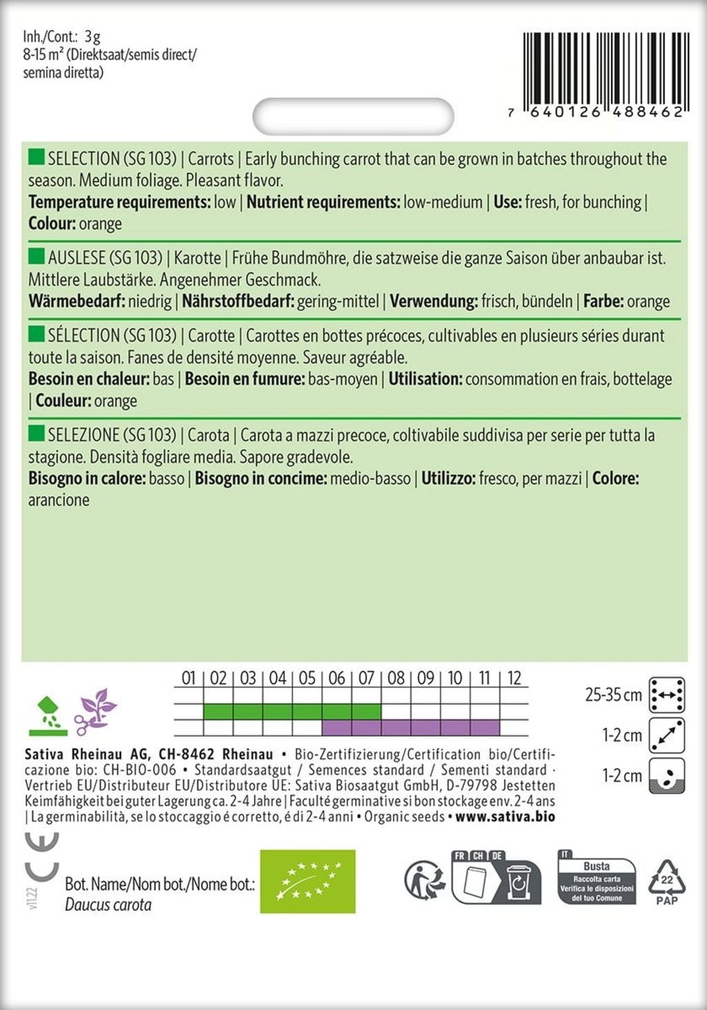 Raná svazková mrkev, kterou lze pěstovat postupně po celou sezónu. Oranžové mrkve mají příjemnou chuť a lze je konzumovat syrové i tepelně upravené.