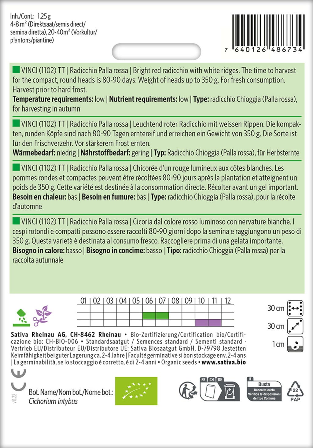 Bio Radicchio "Vinci" má zářivě červenou barvu s bílým žebrováním. Hlávky jsou kompaktní a kulaté. Sklízet je lze po 80-90 dnech, kdy váží přibližně 350 g. Ideální zelenina pro přímou konzumaci!