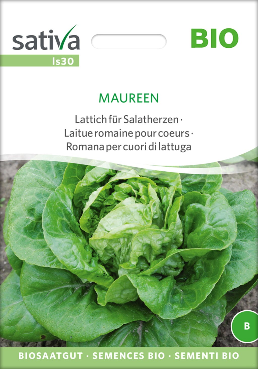 Bio římský salát "Maureen" se skvěle hodí pro pěstování salátových srdíček, a proto jej lze sázet i v hustším sponu. Má pouze nízké nároky na teplo a lze jej sklízet od června.