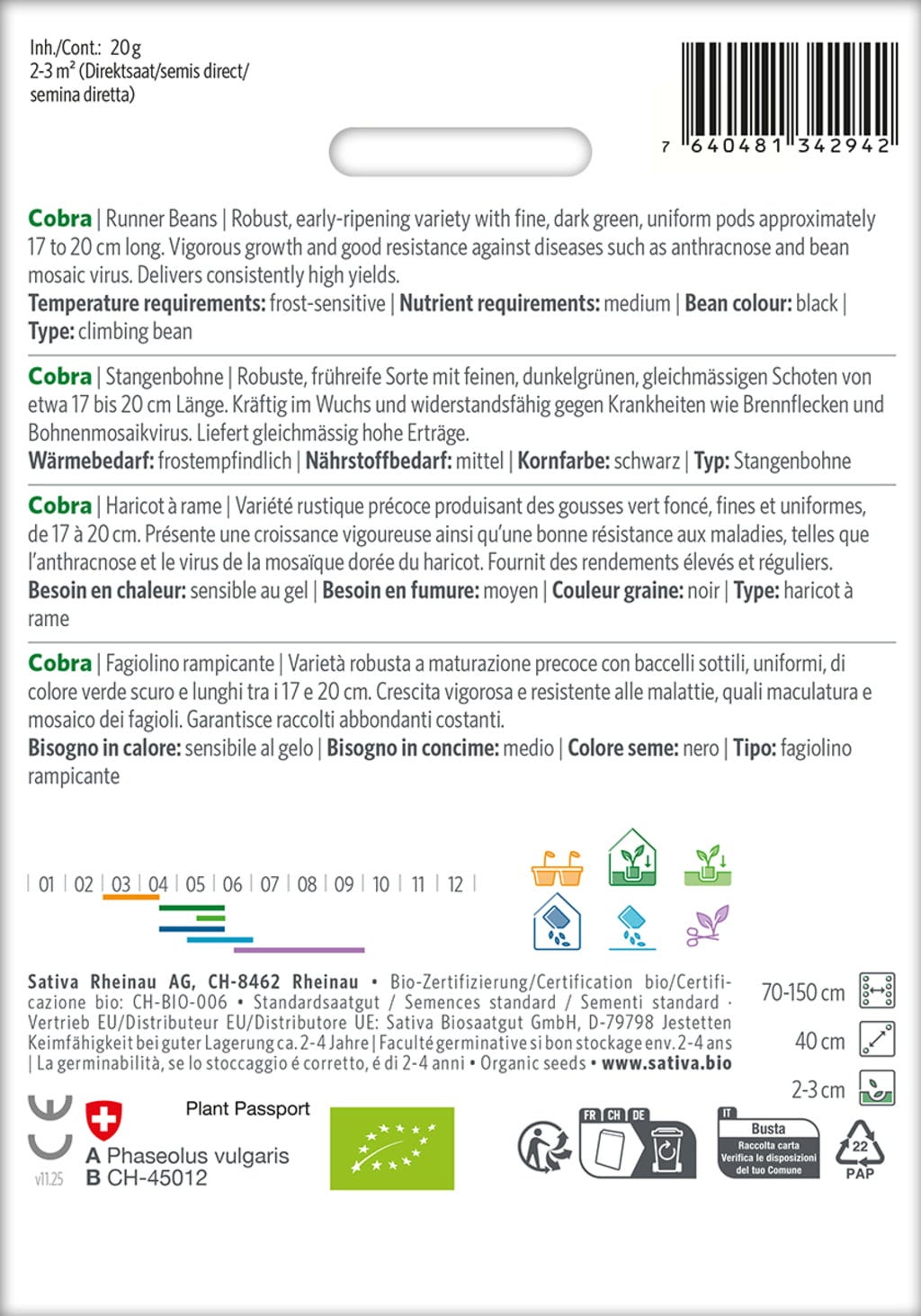 Tyčkový fazol Cobra přesvědčí silným růstem, jemnými, tmavě zelenými lusky a spolehlivě vysokými výnosy a je vhodný jak pro komerční pěstování, tak pro ambiciózní hobby zahradníky. Při dobré péči poskytuje rovnoměrnou sklizeň zejména ve skleníku, je však citlivý na mráz a vyžaduje teplé stanoviště.