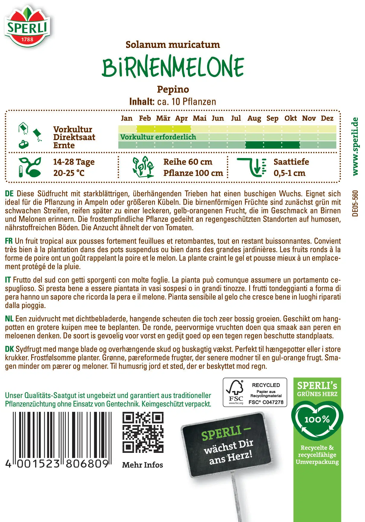 Hruškový meloun Pepino vytváří mimořádně lahodné plody, jejichž sladká chuť připomíná hrušky a medové melouny. Rostliny nejsou mrazuvzdorné. Výborná závěsná nebo nádobová rostlina.