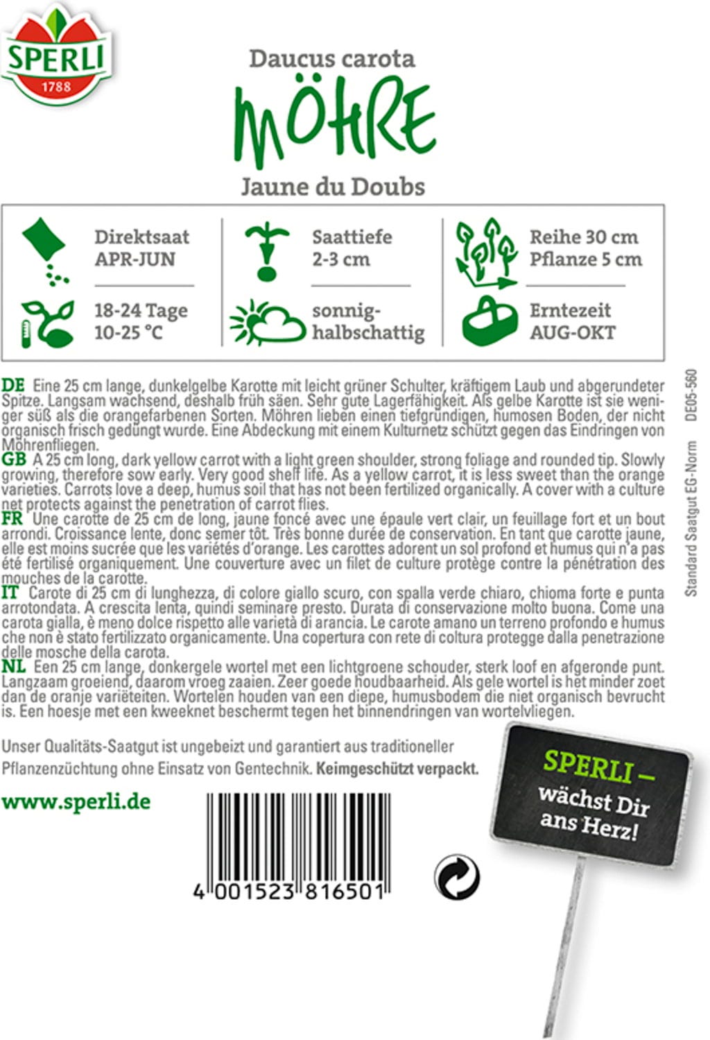 Jaune du Doubs je odrůda známá jako krmná mrkev. Její dlouhé, tupě zakončené, válcovité kořeny jsou zlatožluté se zelenou hlavou. Kořeny i nať jsou ideální jako krmivo pro drobná zvířata, koně a volně žijící zvěř. Bujně rostoucí a výnosná odrůda s dobrou krmnou hodnotou.