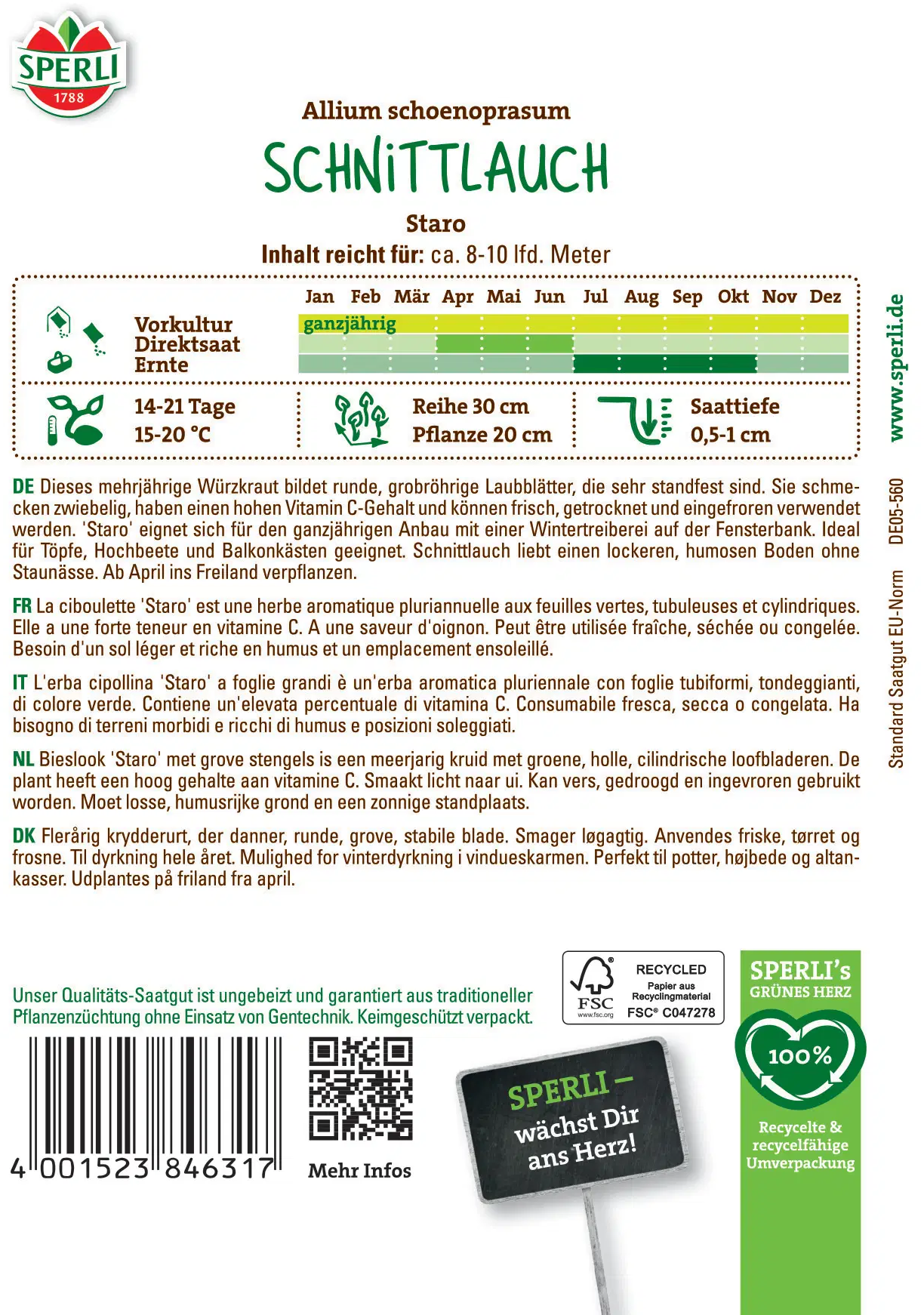 Pažitka Staro od Sperli zaujme svými silnými, aromatickými dutými listy, které dodají každému pokrmu svěží cibulovou notu. Ať už ve vyvýšeném záhonu, v květináči nebo přímo na zahradě - tato odrůda je obzvlášť robustní, nenáročná na péči a ideální pro dlouhou dobu sklizně. Lze ji vysévat přímo od dubna do června a od července se těšit na bohatou sklizeň čerstvé natě.