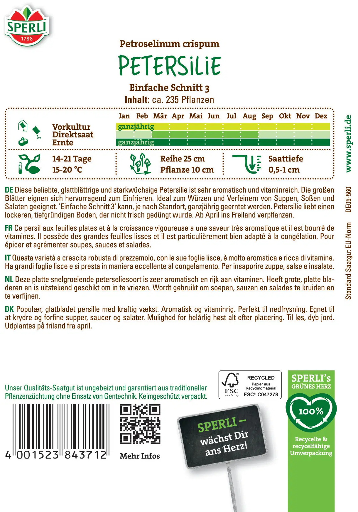 Hladká petržel Einfache Schnitt 3 zaujme silným růstem a intenzivně aromatickými listy, které lze v kuchyni všestranně využít. Ať už na záhoně, na balkoně nebo v květináčích na parapetu - tato odrůda je nenáročná na péči a obzvlášť výnosná.