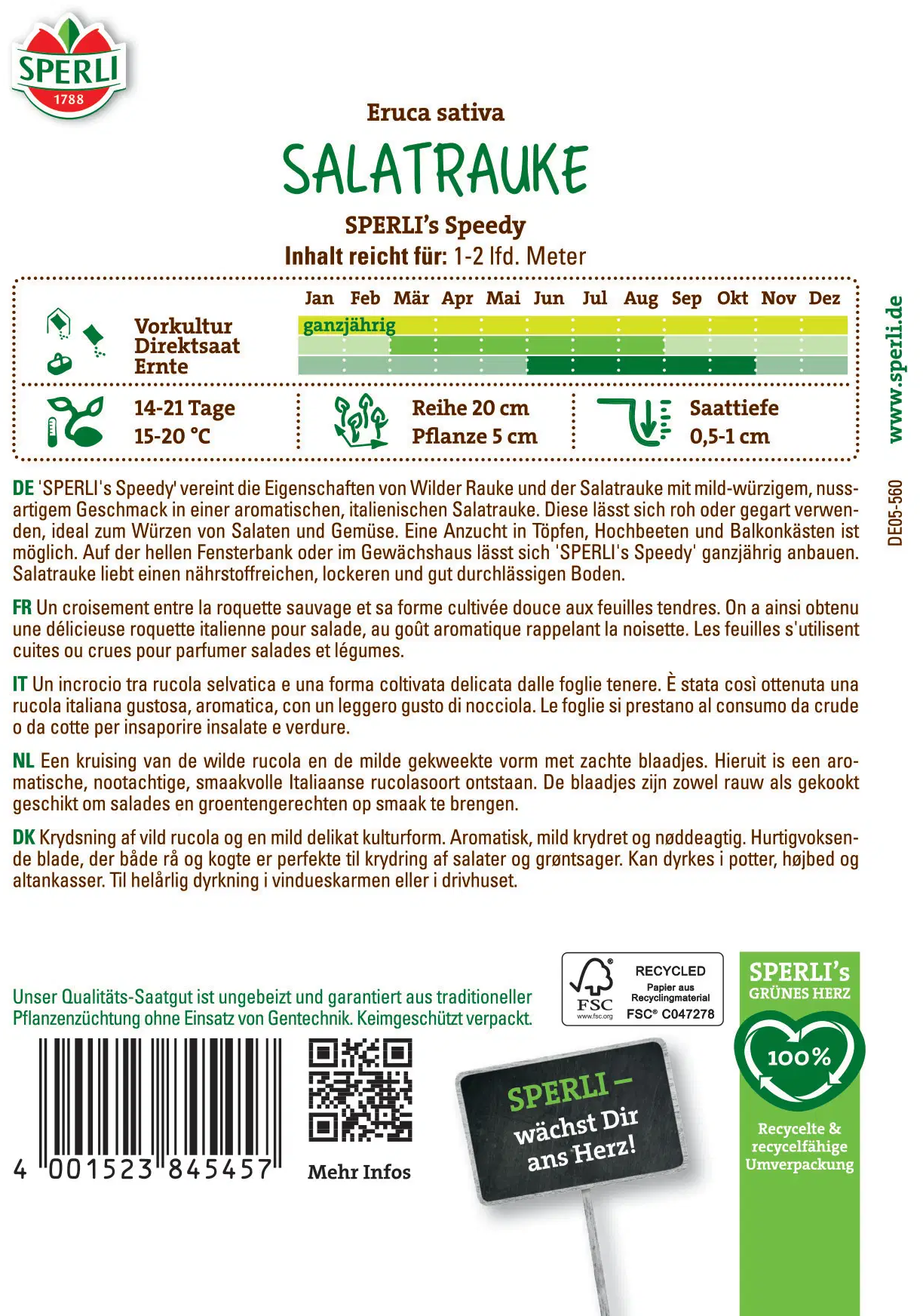 Salátová rukola SPERLI’s Speedy je obzvlášť rychle rostoucí odrůda rukoly, která se vyznačuje jemně oříškovou chutí. Vznikla křížením salátové rukoly a plané rukoly - a spojuje to nejlepší z obou: jemné listy, aromatickou chuť a všestranné využití v kuchyni.
