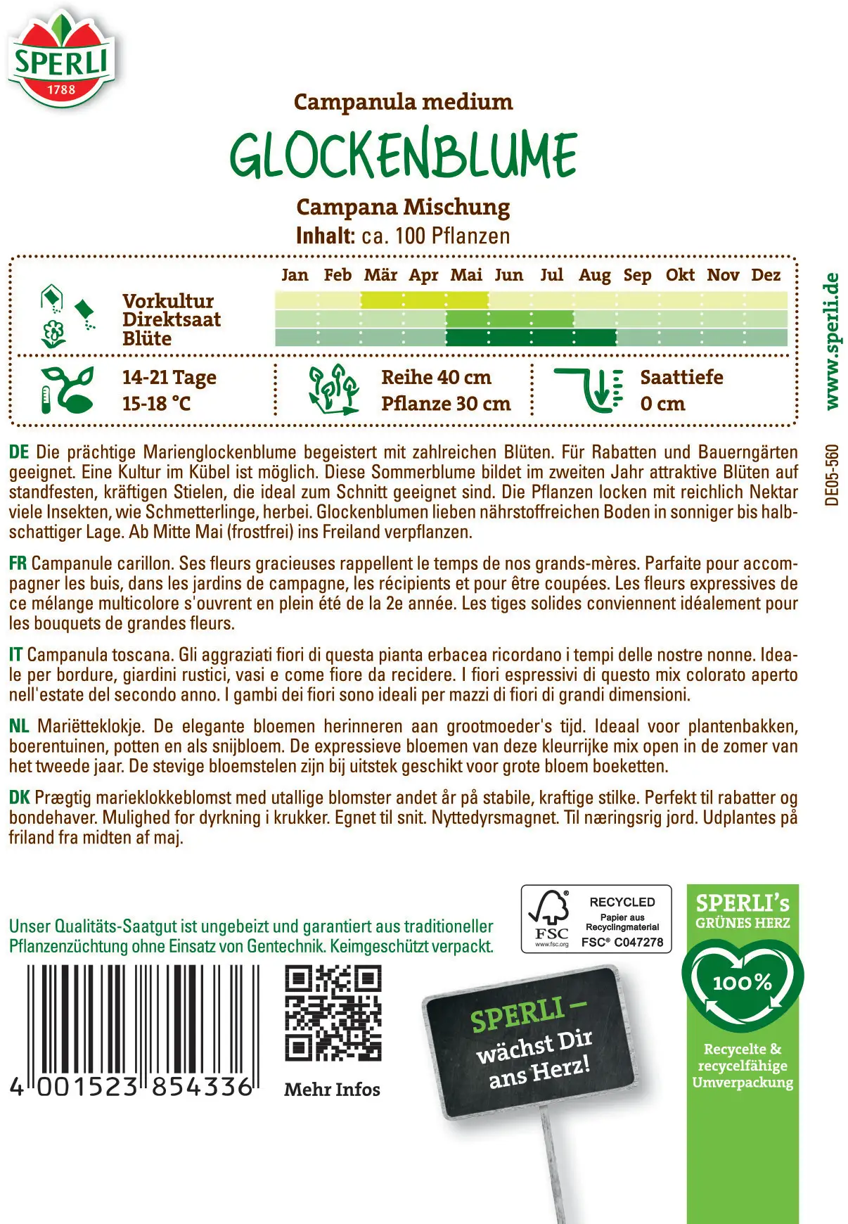 Tato směs zvonků s jednoduchými květy obsahuje vícebarevné, dvouleté rostliny s vysokými, pevnými stonky. Díky barevné rozmanitosti této směsi lze sestavit pěkné velké kytice, které zvlášť dobře vyniknou v džbánech. Ideální také pro přírodně laděné zahrady nebo venkovské zahrady lemované zimostrázem. Zvonky patří mezi rostliny, které vytvářejí zvlášť bohaté množství nektaru a pylu, proto jsou označovány také jako včelí pastva.