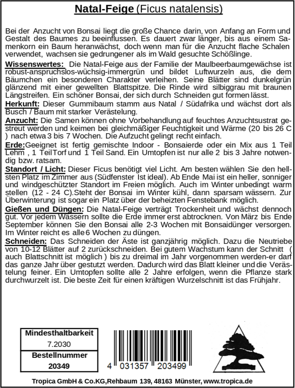 Fíkovník natalský je nenáročná, stálezelená rostlina, která vytváří působivé vzdušné kořeny. Listy mají temně zelenou barvu a zvlněnou špičku. Jedná se o nádhernou pokojovou bonsaj, která se snadno tvaruje.