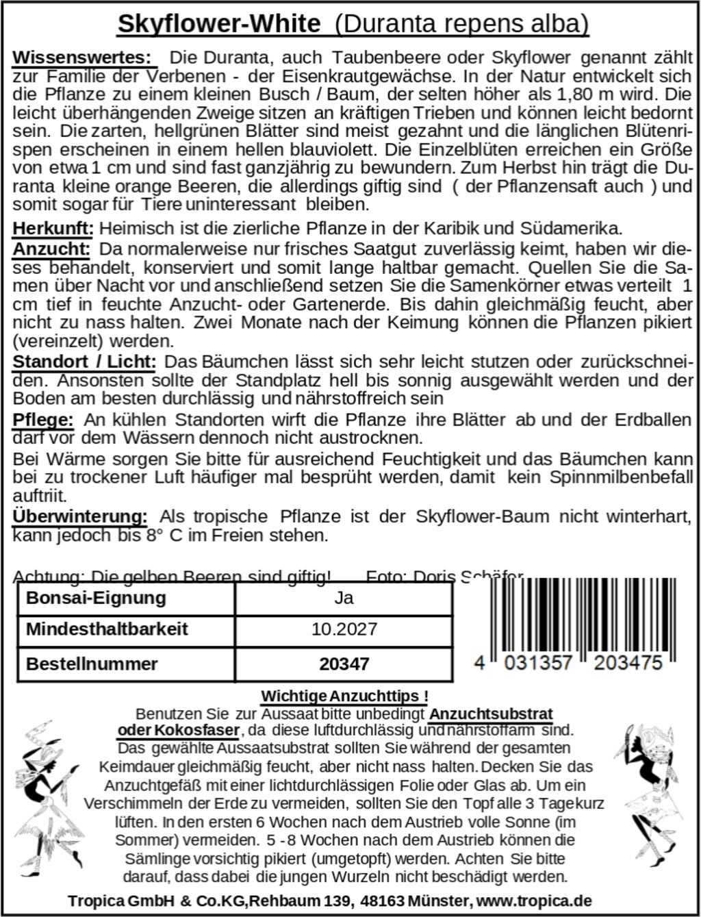 Duranta, známá také jako Skyflower, je kouzelný malý okrasný keř z čeledi sporýšovitých. Se svými světle zelenými, pilovitými listy a jemně modrofialovými květenstvími, která kvetou téměř po celý rok, přitahuje Duranta veškerou pozornost. Na podzim rostlina vytváří malé oranžové bobule, které jsou však pro lidi i zvířata jedovaté.